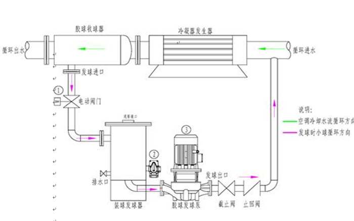 膠球清洗--膠球清洗裝置---凝汽器膠球清洗裝置選用合適的膠球,將膠球從裝球室手孔處投入裝球室內(nèi),投球數(shù)量為主機冷卻水管數(shù)的10%左右。先打開收球網(wǎng)的球閥,然后啟動膠球泵,關(guān)閉放水閥,再打開裝球室上的排氣閥,排完裝球室內(nèi)的空氣,關(guān)閉排氣閥,再打開送球管道中間的球閥,當(dāng)水流正常運行時慢慢打開裝球室的切換閥,不宜過猛的切換,過猛切換會導(dǎo)致收球網(wǎng)堵球。膠球在循環(huán)水流帶動下進入凝汽器水室。膠球在循環(huán)水進出口壓力差的作用下跳動洗刷冷卻管內(nèi)泥沙污物,對冷卻管內(nèi)進行一次抹擦,使冷卻管內(nèi)壁泥沙污垢隨著水流帶出,膠球經(jīng)循環(huán)水的帶動下進入收球網(wǎng),收球網(wǎng)將膠球分離出來,由膠球泵將膠球重新吸入裝球室,按此規(guī)律往復(fù)循環(huán)對中央空調(diào)主機冷卻水管進行連續(xù)清洗,運行時間一般為40分鐘 。